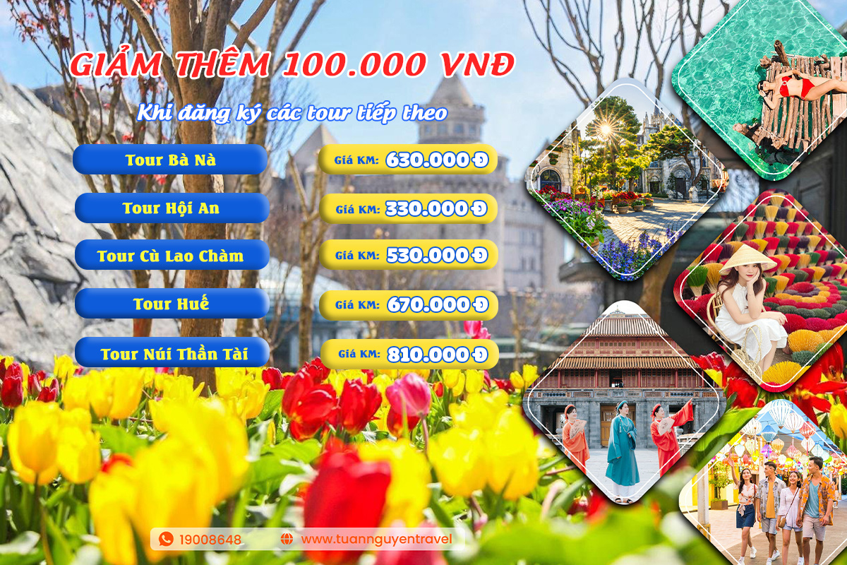Giảm thêm 100.000VNĐ khi Quý khách đăng ký thêm tour thứ 2: Hội An, Bà Nà, Cù Lao Chàm, Núi Thần Tài, Rừng dừa bảy mẫu,..